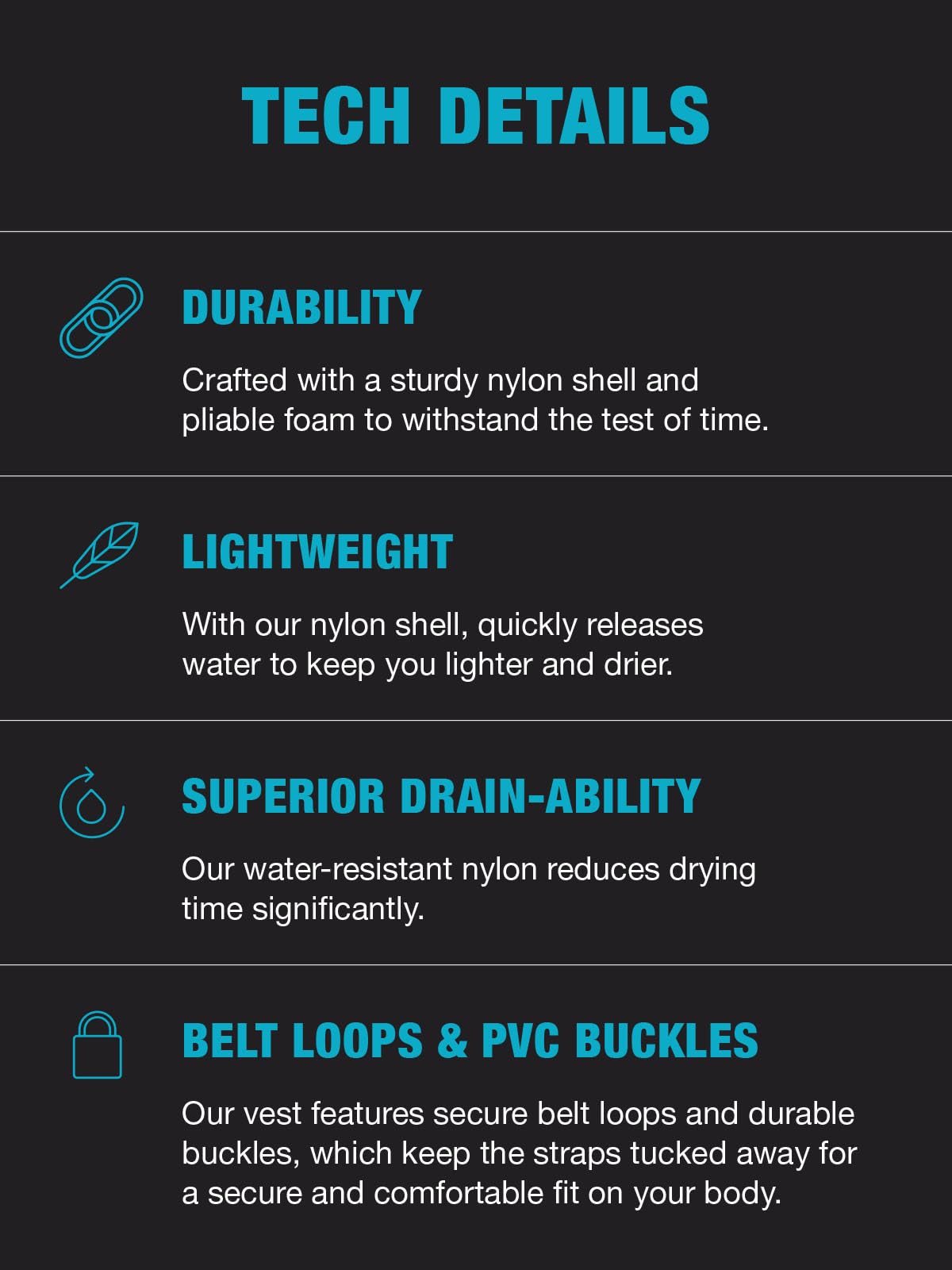- HYPERVENT TECHNOLOGY: This life jacket for adults is equipped with superior drainability and has temperature regulating technology that keeps you comfortable in and out of the water.